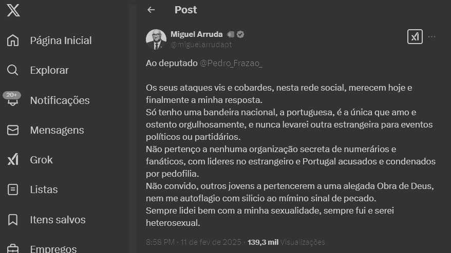 O deputado não-inscrito Miguel Arruda, deixou esta terça-feira duas mensagens na rede social X, onde faz graves insinuações sobre os deputados do Chega Pedro Frazão e António Pinto Pereira.
