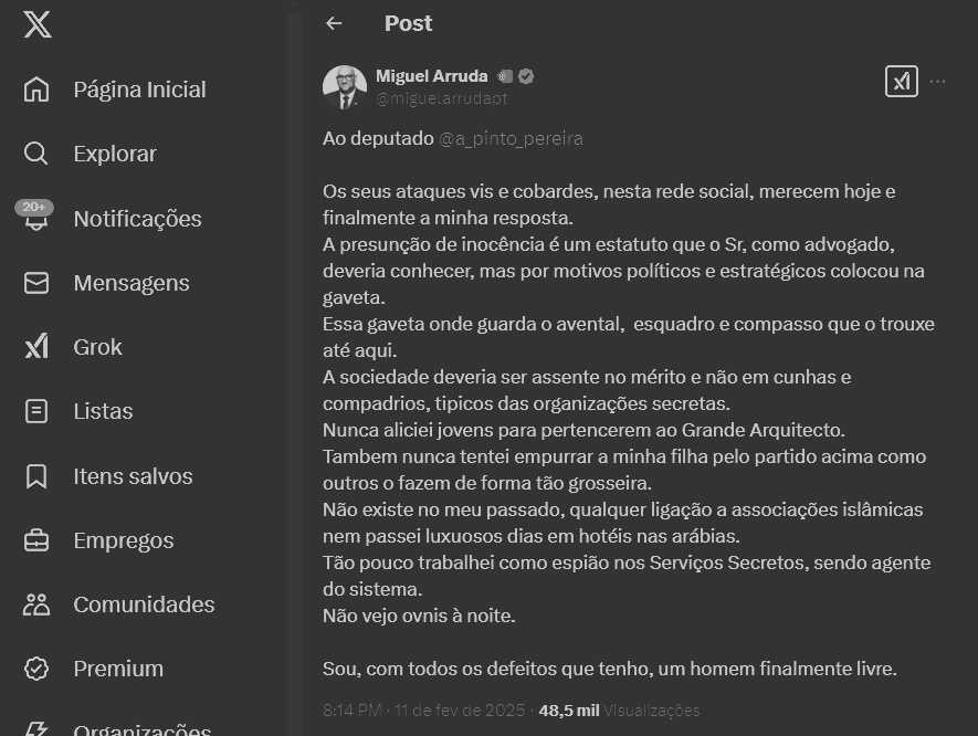 Numa outra publicação, Miguel Arruda dirige-se a António Pinto Pereira dizendo que este, “como advogado”, deveria saber que “a presunção de inocência é um estatuto.” Sugere ainda que o deputado do Chega está ligado a “organizações secretas.” Faz ainda referência a um suposto “aliciamento de jovens para o “Grande Arquiteto”, o Deus na maçonaria.
